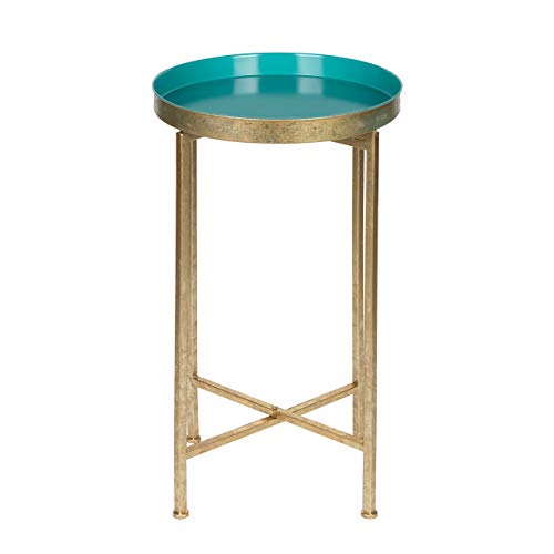 Kate and Laurel Celia Round Metal Foldable Tray Accent Table, Teal with Gold Base